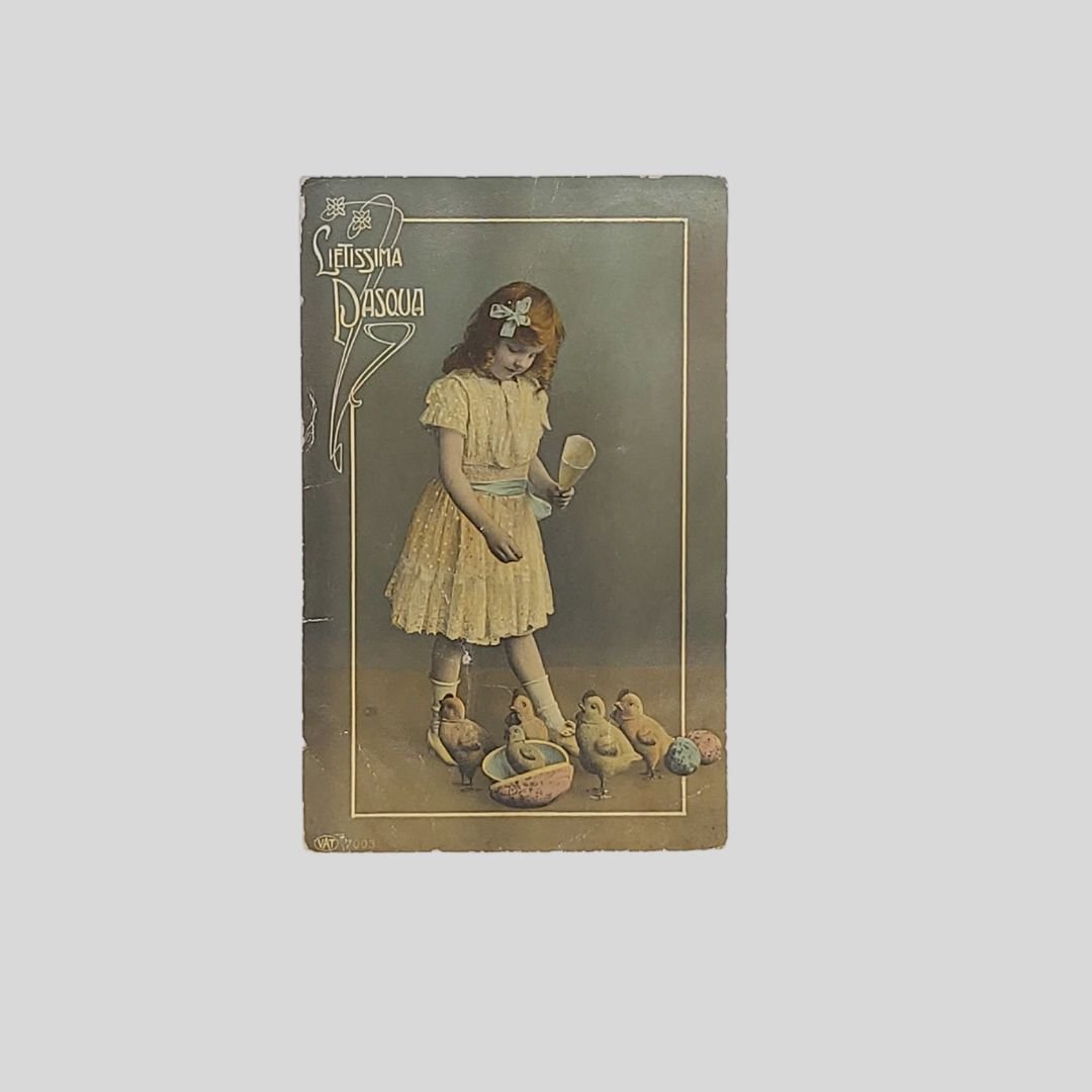 Bambina con pulcini e uova. Lietissima Pasqua. | Cartoline |