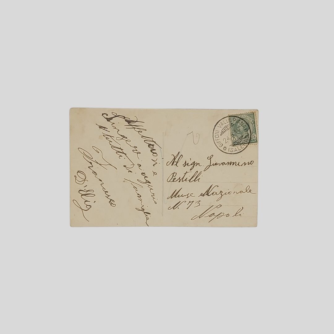 cm 9×14. Cartolina augurale d’epoca. Viaggiata. Francobollo, timbro (24/3/1912). Forti tracce d’uso. Serie 7003.