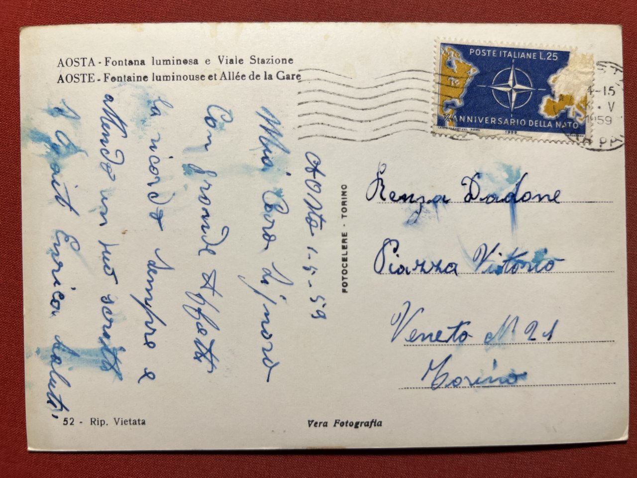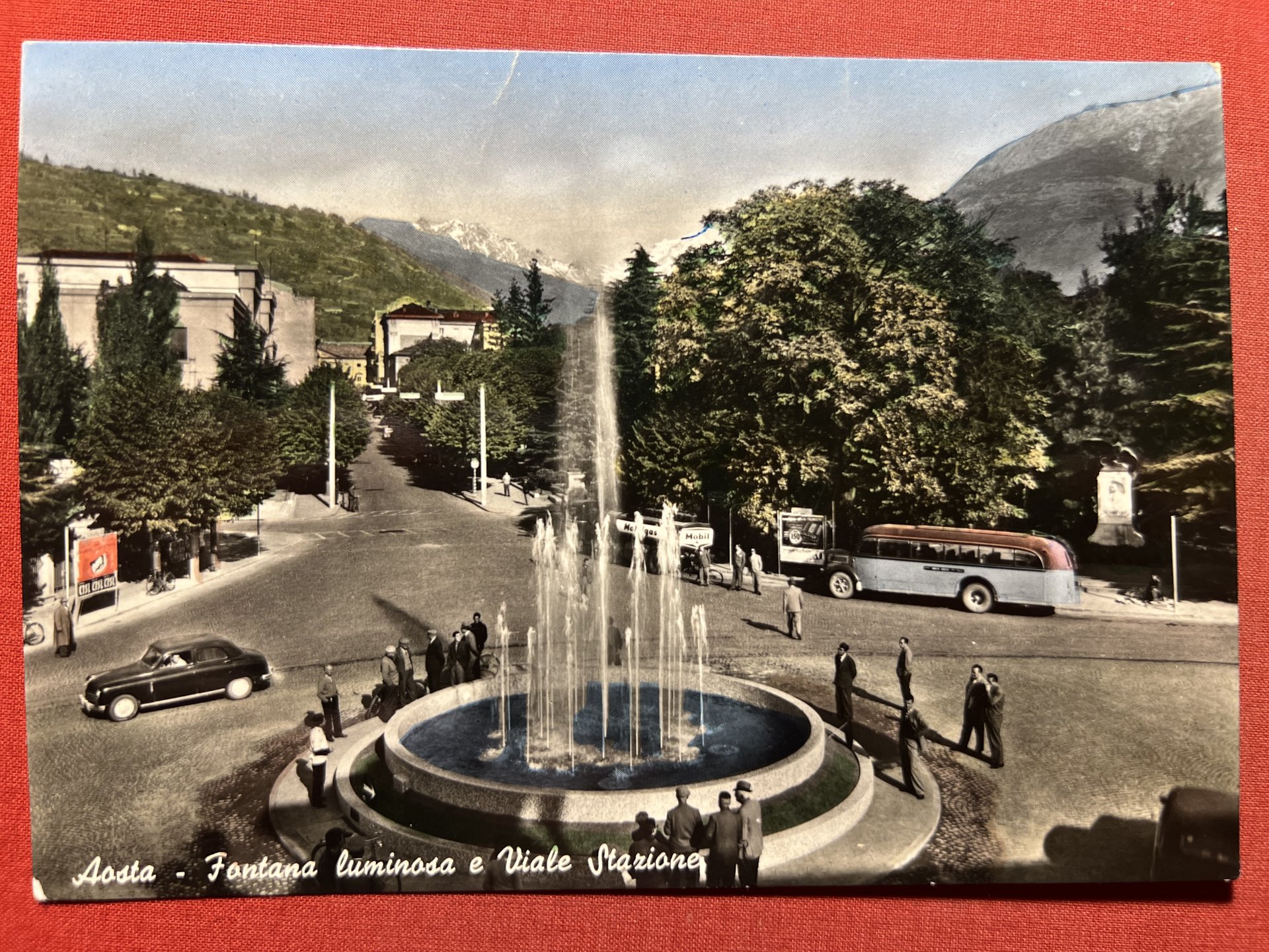 Cartolina - Aosta - Fontana Luminosa e Viale Stazione - 1959