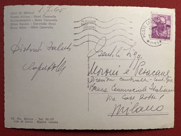 Cartolina - Lido di Jesolo - Piazza Milano - Hotel Caravelle - 1965 | Cartoline |