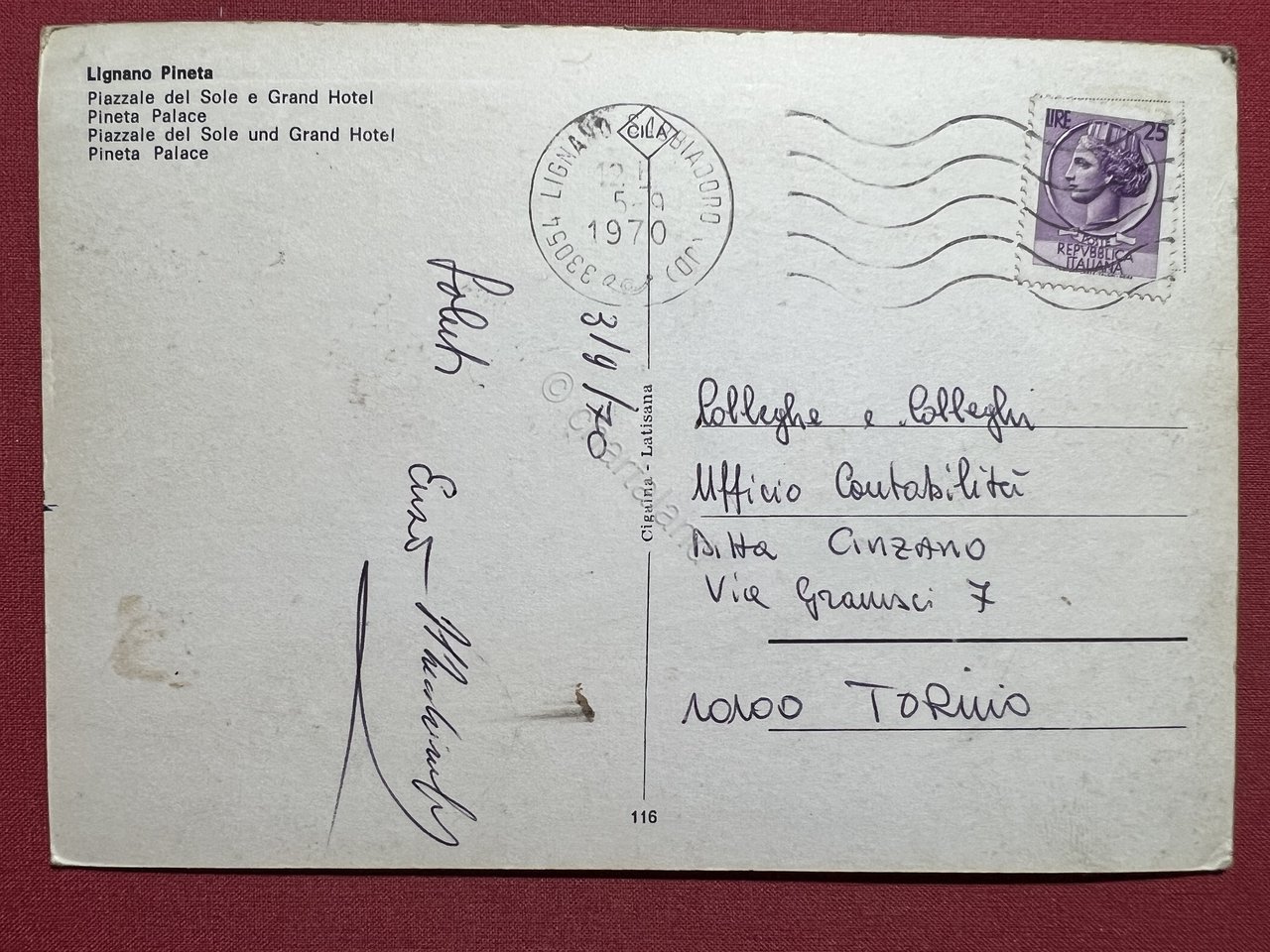 Cartolina - Lignano Pineta - Piazzale del Sole e Grand Hotel - 1970 | Cartoline |