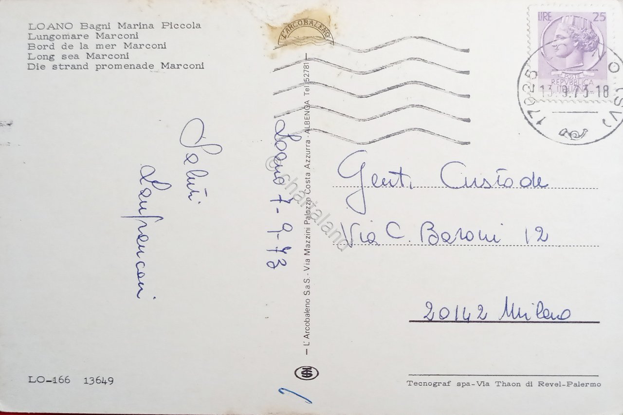 Cartolina - Loano - Bagni Marina Piccola - Lungomare Marconi - 1973 | Cartoline |