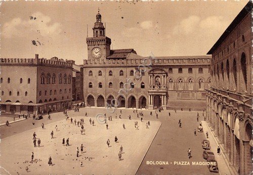 Cartolina Bologna Piazza Maggiore animata auto d'epoca 1957