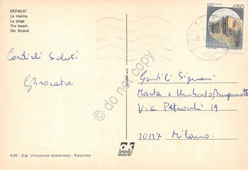 Cartolina Cefalù la marina case sulla spiaggia barche pescatori