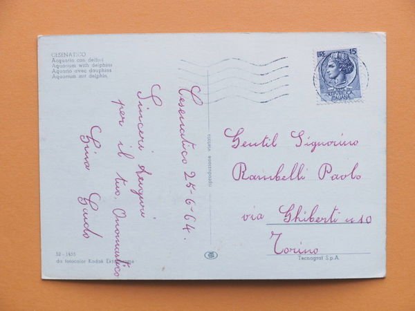Cartolina Cesenatico - Acquario con delfini - 1964 1964 Cartolina formato grande - viaggiata Condizioni buone, come da foto Piccola piega all'angolo superiore sinistro Per appassionati, studiosi e collezionisti