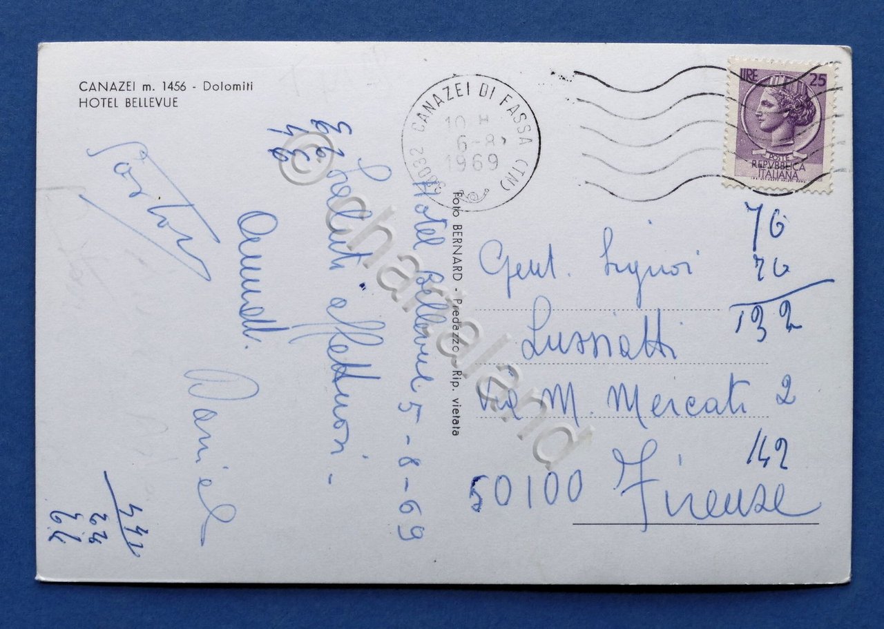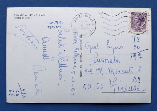 Cartolina Dolomiti - Canazei - Hotel Bellevue - 1969 1969 Cartolina formato grande - viaggiata Condizioni buone, come da foto Per appassionati, studiosi e collezionisti