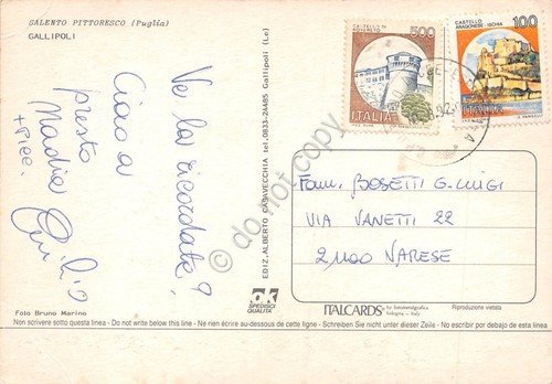 Cartolina Gallipoli panorama lungomare e spiaggia grinza al timbro