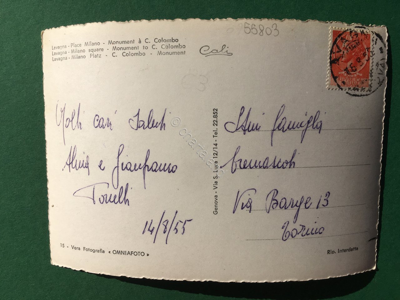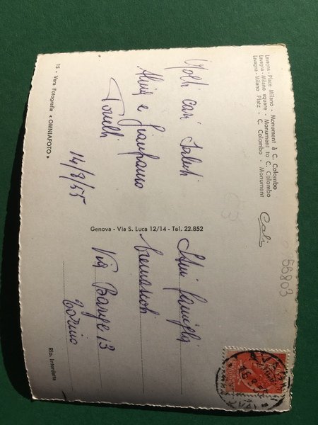 Cartolina Lavagna - Piazza Milano - Monumento C.Colombo - 1955