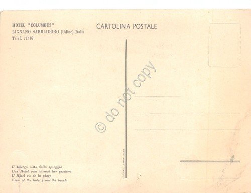 Cartolina Lignano Sabbiadoro Hotel Columbus dal mare spiaggi animata