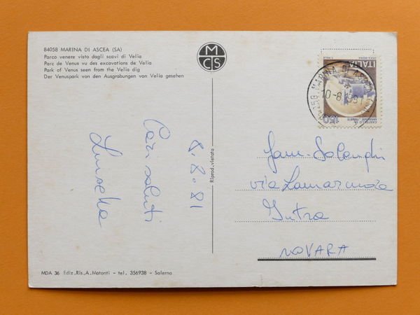 Cartolina Marina di Ascea - Parco Venere visto dagli scavi di Velia - 1981 1981 Cartolina formato grande - viaggiata Condizioni buone, come da foto Per appassionati, studiosi e collezionisti