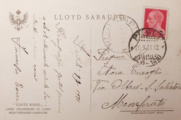 Cartolina Navigazione LLoyd Sabaudo - Nave Conte Rosso - 1931 | Cartoline |