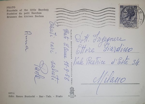 Cartolina - Prato - Fontana del Bacchino - 1958