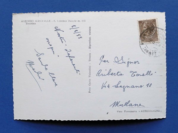 Cartolina S. Lorenzo Banale - Albergo Miravalle - 1955 1955 Cartolina formato grande - viaggiata Condizioni buone, come da foto Per appassionati, studiosi e collezionisti