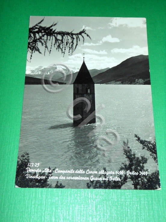 " *** Cartolina Venosta Alta - Campanile della Curon - Ortles. La cartolina è viaggiata. Datata 1957. Formato grande. Per appassionati, studiosi e collezionisti