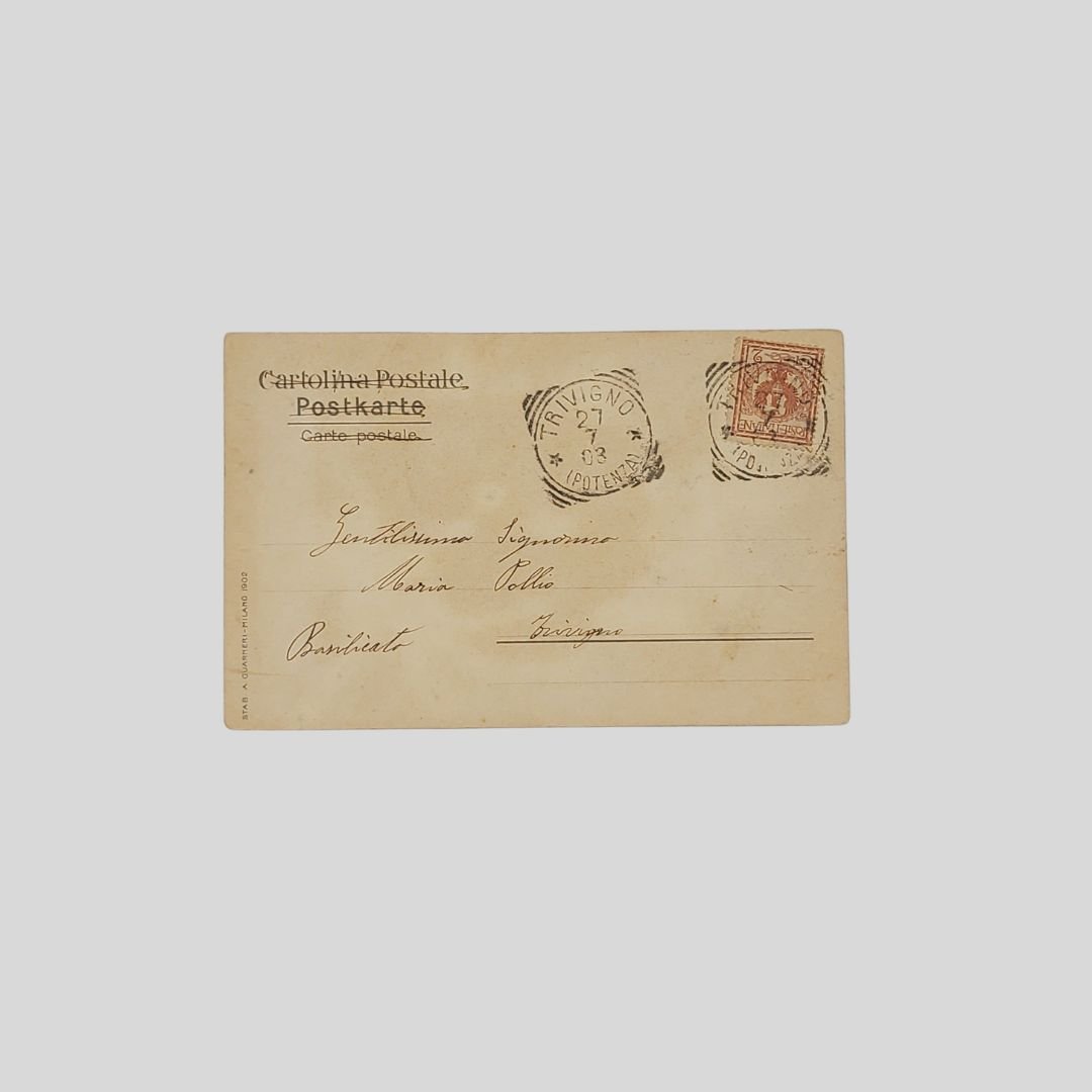 Cartolina goffrata d’epoca. Undivided back. Viaggiata, s.d. (primi ‘900) cm 9×14. Francobollo, timbri (27/7/1903). Lievi tracce d’uso agli angoli.