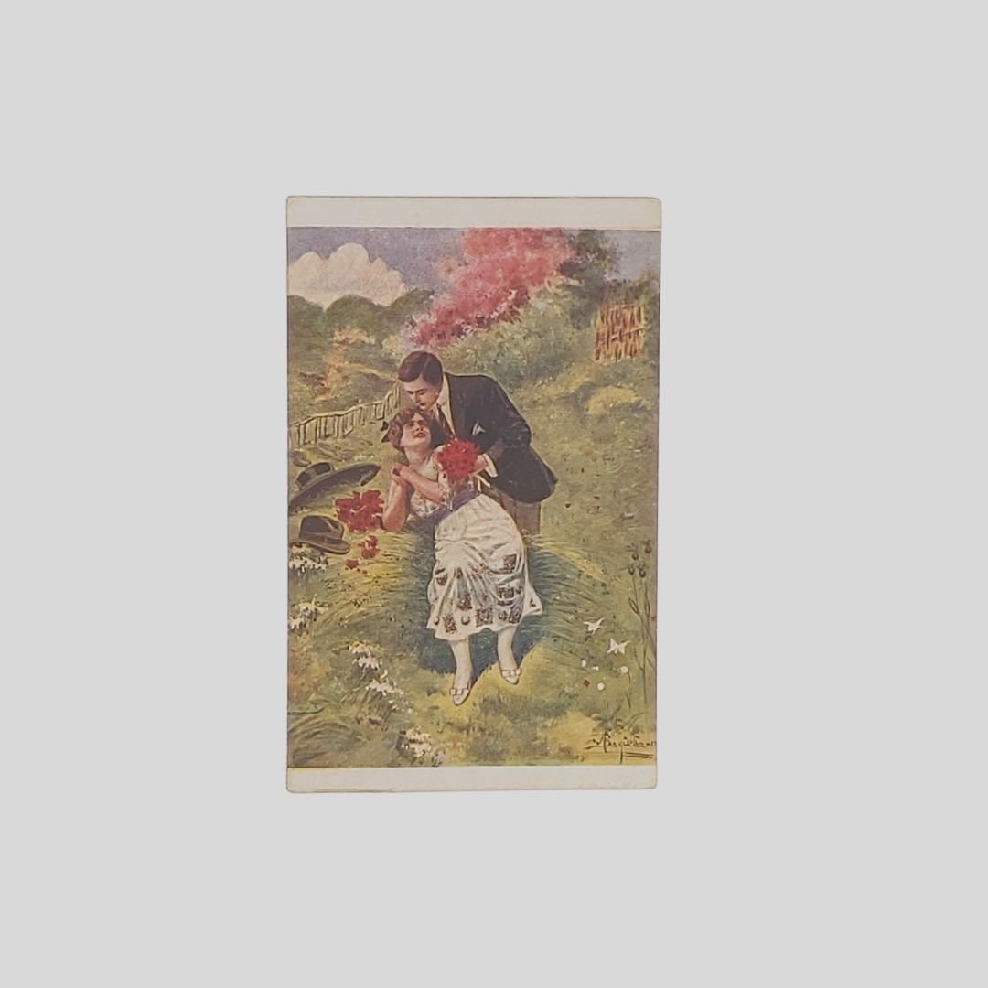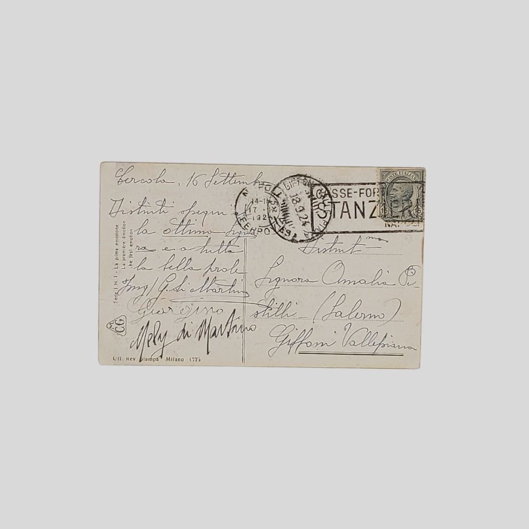 Cartolina d’epoca. Viaggiata, invio del 16/9/1924, cm 8,5×13,5. Francobollo, timbri. Lievi tracce d’uso agli angoli. Serie I n. 1: La prima emozione.