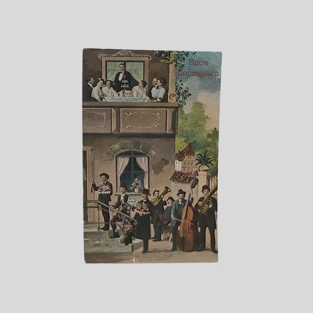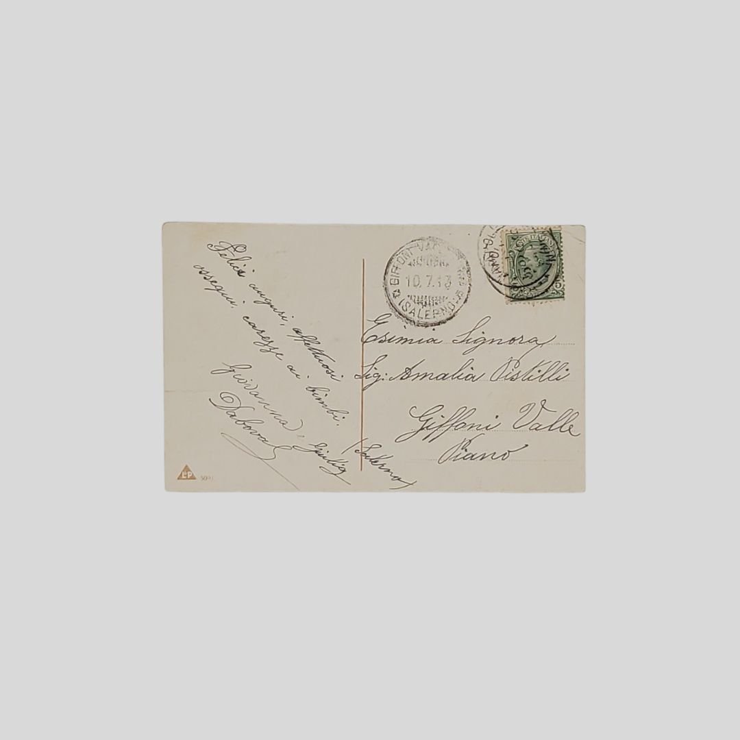 Cartolina augurale d’epoca. Viaggiata, cm 9×14. Francobollo, timbri (10/7/1913). Lievemente ondulata. Piegature all’angolo superiore e al margine inferiore. Serie 5001