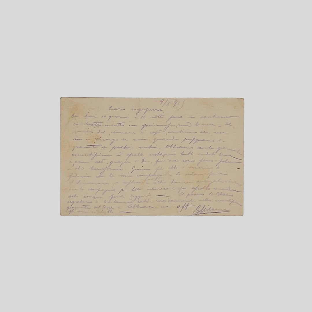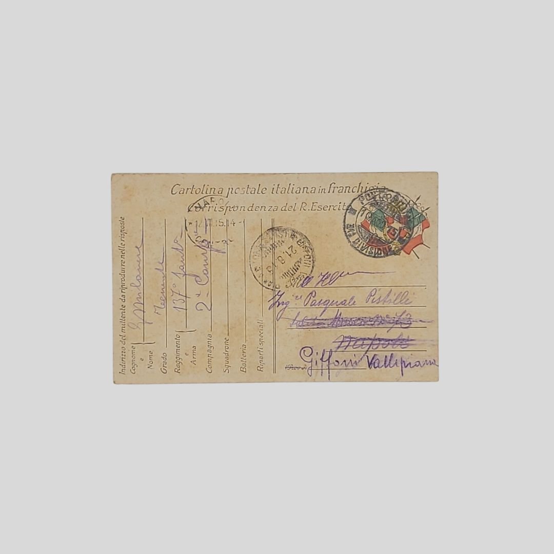 Cartolina in franchigia del R. Esercito. Viaggiata, cm 14×9. Timbro posta militare (10/8/1915) . Inviata in provincia di Salerno. Tracce d’uso al recto-verso.