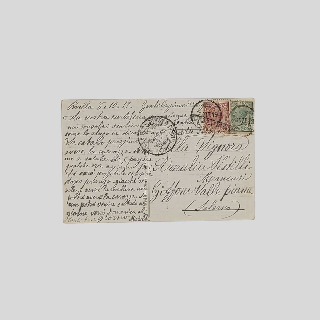 Cartolina d’epoca. Viaggiata, invio del 8/10/1919, cm 14×9. Francobolli, timbri. Lievi tracce d’uso.
