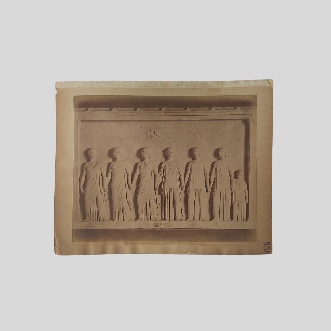 Due fotografie originali all’albumina, applicate al recto/verso di cartoncino dell’epoca, 1880 ca., cm 25,3×20,5 più supporto. Didascalie stampate su lastra con codici editoriali. Supporto lievemente ondulato. In buone condizioni. Giacomo Brogi: due fotografie originali all’albumina raffiguranti bassorilievi del Museo Archeologico Nazionale di Napoli. Didascalia codice n. 12577: Napoli. Museo Nazionale. Sarcofago rappresentante Achille alla Corte di Licomede (Basilicata). Didascalia codice n. 5225: Napoli. Museo Nazionale. Le tre Grazie con varie Ninfe (Ercolano). Giacomo Brogi [Firenze, 1822-1881]. È stato uno dei più importanti fotografi ed editori italiani del XIX secolo. Iniziò la sua carriera come incisore prima di dedicarsi alla fotografia. Nel 1859 aprì a Firenze la ditta “Giacomo Brogi fotografo”. Lo studio ebbe diverse sedi prestigiose a Firenze, tra cui Lung’Arno delle Grazie e Corso Tintori. Sotto la sua guida, l’azienda divenne un punto di riferimento internazionale, con succursali anche a Roma e Napoli (dopo il 1870). Documentò sistematicamente il patrimonio artistico e paesaggistico dell’Italia post-unitaria. Nel 1878 la sua fama è tale da venire nominato “fotografo del re”.