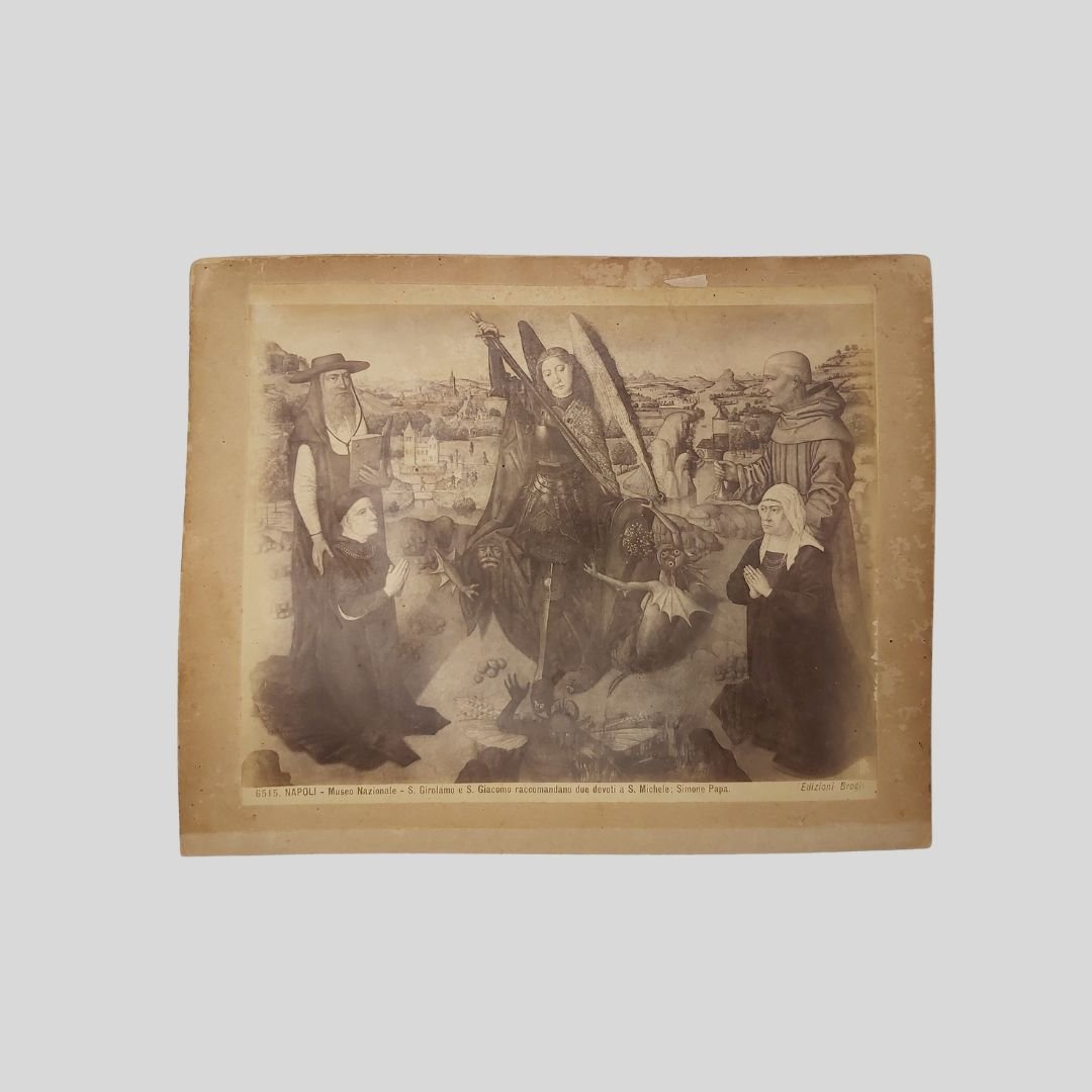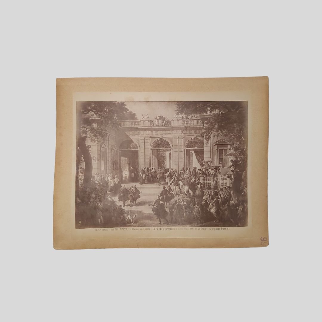 Due fotografie originali all’albumina, applicate al recto/verso di cartoncino dell’epoca, 1880 ca., cm 25,1×20,5 più supporto. Didascalie stampate su lastra con codici editoriali. Supporto lievemente ondulato. In buone condizioni. Giacomo Brogi: due fotografie originali all’albumina raffiguranti dipinti del Museo Archeologico Nazionale di Napoli. Didascalia codice n. 6515: Napoli. Museo Nazionale. S. Girolamo e S. Giacomo raccomandato due devoti a S. Michele: Simone Papa.Didascalia codice n. 6856: Napoli. Museo Nazionale. Carlo III si presenta a Benedetto XIV in Vaticano: Gianpaolo Pannini. Giacomo Brogi [Firenze, 1822-1881]. È stato uno dei più importanti fotografi ed editori italiani del XIX secolo. Iniziò la sua carriera come incisore prima di dedicarsi alla fotografia. Nel 1859 aprì a Firenze la ditta “Giacomo Brogi fotografo”. Lo studio ebbe diverse sedi prestigiose a Firenze, tra cui Lung’Arno delle Grazie e Corso Tintori. Sotto la sua guida, l’azienda divenne un punto di riferimento internazionale, con succursali anche a Roma e Napoli (dopo il 1870). Documentò sistematicamente il patrimonio artistico e paesaggistico dell’Italia post-unitaria. Nel 1878 la sua fama è tale da venire nominato “fotografo del re”.