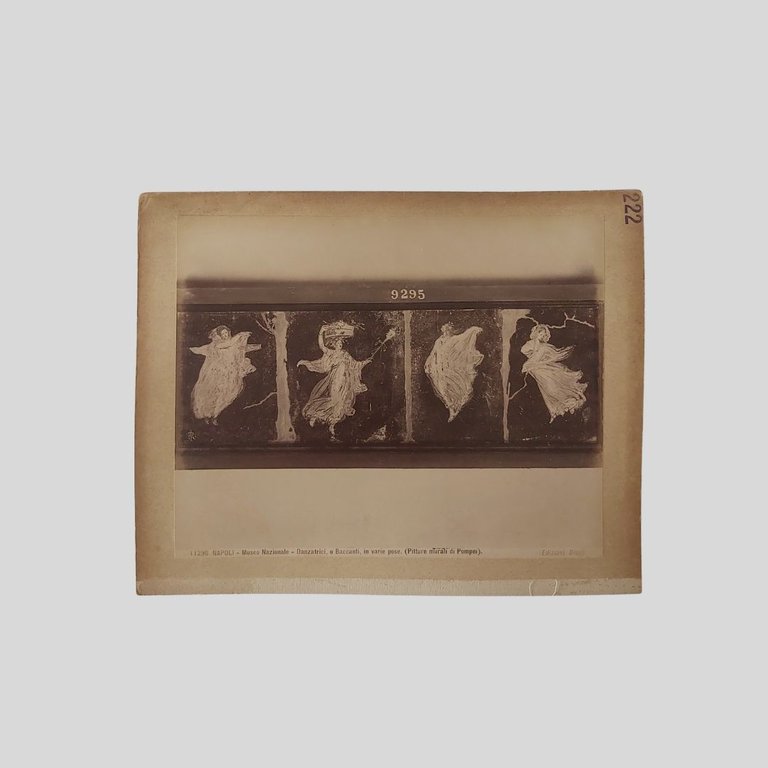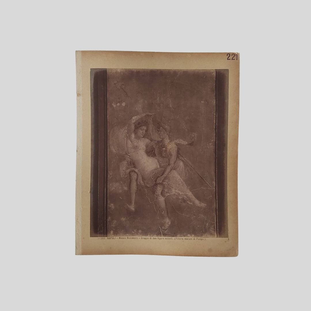 Due fotografie originali all’albumina, applicate al recto/verso di cartoncino dell’epoca, 1880 ca., cm 23,3×25,2 più supporto. Didascalie stampate su lastra con codici editoriali. Supporto lievemente ondulato. In buone condizioni. Giacomo Brogi: due fotografie originali all’albumina raffiguranti pitture murali di Pompei del Museo Archeologico Nazionale di Napoli. Didascalia codice n. 11290: Napoli. Museo Nazionale. Danzatrici, o Baccanti in varie pose (Pittura murale di Pompei). Didascalia codice n. 11290: Napoli. Museo Nazionale. Danzatrici, o Baccanti in varie pose (Pittura murale di Pompei). Didascalia codice n. 11302: Napoli. Museo Nazionale. Gruppo di due figure volanti (Pittura murale di Pompei) Giacomo Brogi [Firenze, 1822-1881]. È stato uno dei più importanti fotografi ed editori italiani del XIX secolo. Iniziò la sua carriera come incisore prima di dedicarsi alla fotografia. Nel 1859 aprì a Firenze la ditta “Giacomo Brogi fotografo”. Lo studio ebbe diverse sedi prestigiose a Firenze, tra cui Lung’Arno delle Grazie e Corso Tintori. Sotto la sua guida, l’azienda divenne un punto di riferimento internazionale, con succursali anche a Roma e Napoli (dopo il 1870). Documentò sistematicamente il patrimonio artistico e paesaggistico dell’Italia post-unitaria. Nel 1878 la sua fama è tale da venire nominato “fotografo del re”.