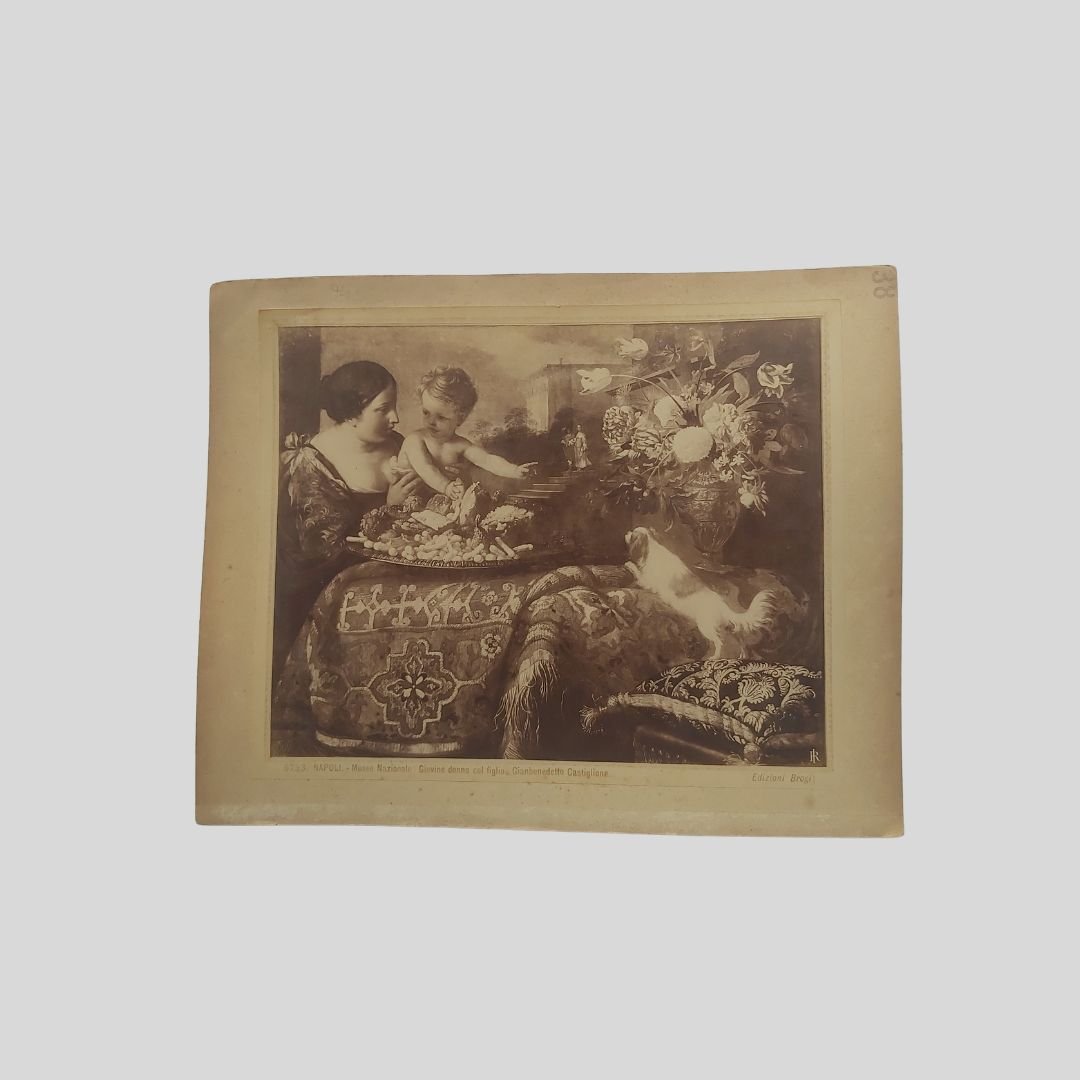 Due fotografie originali all’albumina, applicate al recto/verso di cartoncino dell’epoca, 1880 ca., cm 20,5×25,7 più supporto. Didascalie stampate su lastra con codici editoriali. Supporto lievemente ondulato. In buone condizioni. Giacomo Brogi: due fotografie originali all’albumina raffiguranti dipinti del Museo Archeologico Nazionale di Napoli. Didascalia codice n. 6792: Napoli. Museo Nazionale. Madonna portata in cielo dagli Angioli: G. B. Caracciolo. Didascalia codice n. 6799: Napoli. Museo Nazionale. Giovine donna col figlio: Gianbenedetto Castiglione. Giacomo Brogi [Firenze, 1822-1881]. È stato uno dei più importanti fotografi ed editori italiani del XIX secolo. Iniziò la sua carriera come incisore prima di dedicarsi alla fotografia. Nel 1859 aprì a Firenze la ditta “Giacomo Brogi fotografo”. Lo studio ebbe diverse sedi prestigiose a Firenze, tra cui Lung’Arno delle Grazie e Corso Tintori. Sotto la sua guida, l’azienda divenne un punto di riferimento internazionale, con succursali anche a Roma e Napoli (dopo il 1870). Documentò sistematicamente il patrimonio artistico e paesaggistico dell’Italia post-unitaria. Nel 1878 la sua fama è tale da venire nominato “fotografo del re”.