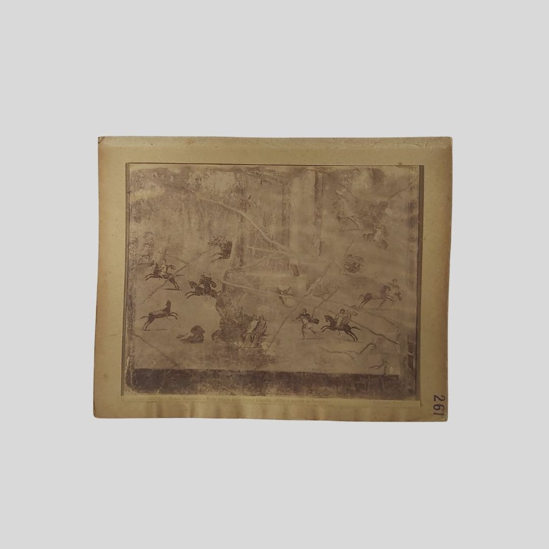 Due fotografie originali all’albumina, applicate al recto/verso di cartoncino dell’epoca, 1880 ca., cm 25,2×20,3 più supporto. Didascalie stampate su lastra con codici editoriali. Supporto lievemente ondulato. In buone condizioni. Giacomo Brogi: due fotografie originali all’albumina raffiguranti pitture murali del Museo Archeologico Nazionale di Napoli.