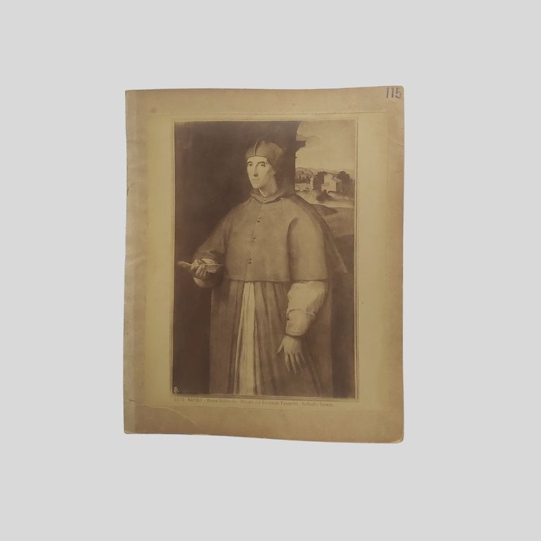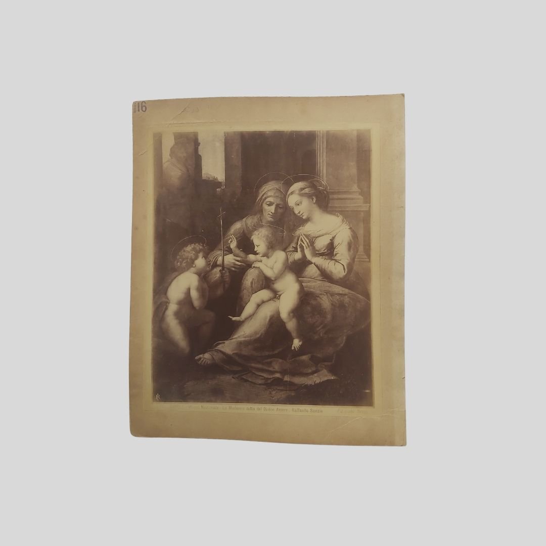 Due fotografie originali all’albumina, applicate al recto/verso di cartoncino dell’epoca, 1880 ca., cm 20,5×25 più supporto. Didascalie stampate su lastra con codici editoriali. Supporto lievemente ondulato. In buone condizioni. Giacomo Brogi: due fotografie originali all’albumina raffiguranti dipinti del Museo Archeologico Nazionale di Napoli. Didascalia codice n. 6870. Napoli. Museo Nazionale. Ritratto del Cardinale Passerini: Raffaello Sanzio. Didascalia codice n. 6871. Napoli. Museo Nazionale. La Madonna detta del Divino Amore: Raffaello Sanzio. Giacomo Brogi [Firenze, 1822-1881]. È stato uno dei più importanti fotografi ed editori italiani del XIX secolo. Iniziò la sua carriera come incisore prima di dedicarsi alla fotografia. Nel 1859 aprì a Firenze la ditta “Giacomo Brogi fotografo”. Lo studio ebbe diverse sedi prestigiose a Firenze, tra cui Lung’Arno delle Grazie e Corso Tintori. Sotto la sua guida, l’azienda divenne un punto di riferimento internazionale, con succursali anche a Roma e Napoli (dopo il 1870). Documentò sistematicamente il patrimonio artistico e paesaggistico dell’Italia post-unitaria. Nel 1878 la sua fama è tale da venire nominato “fotografo del re”.