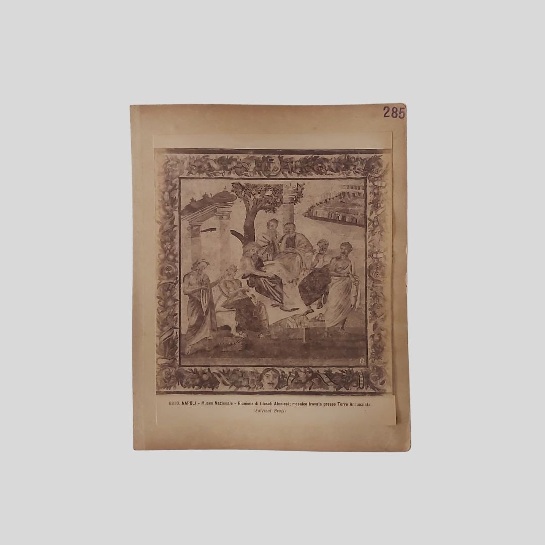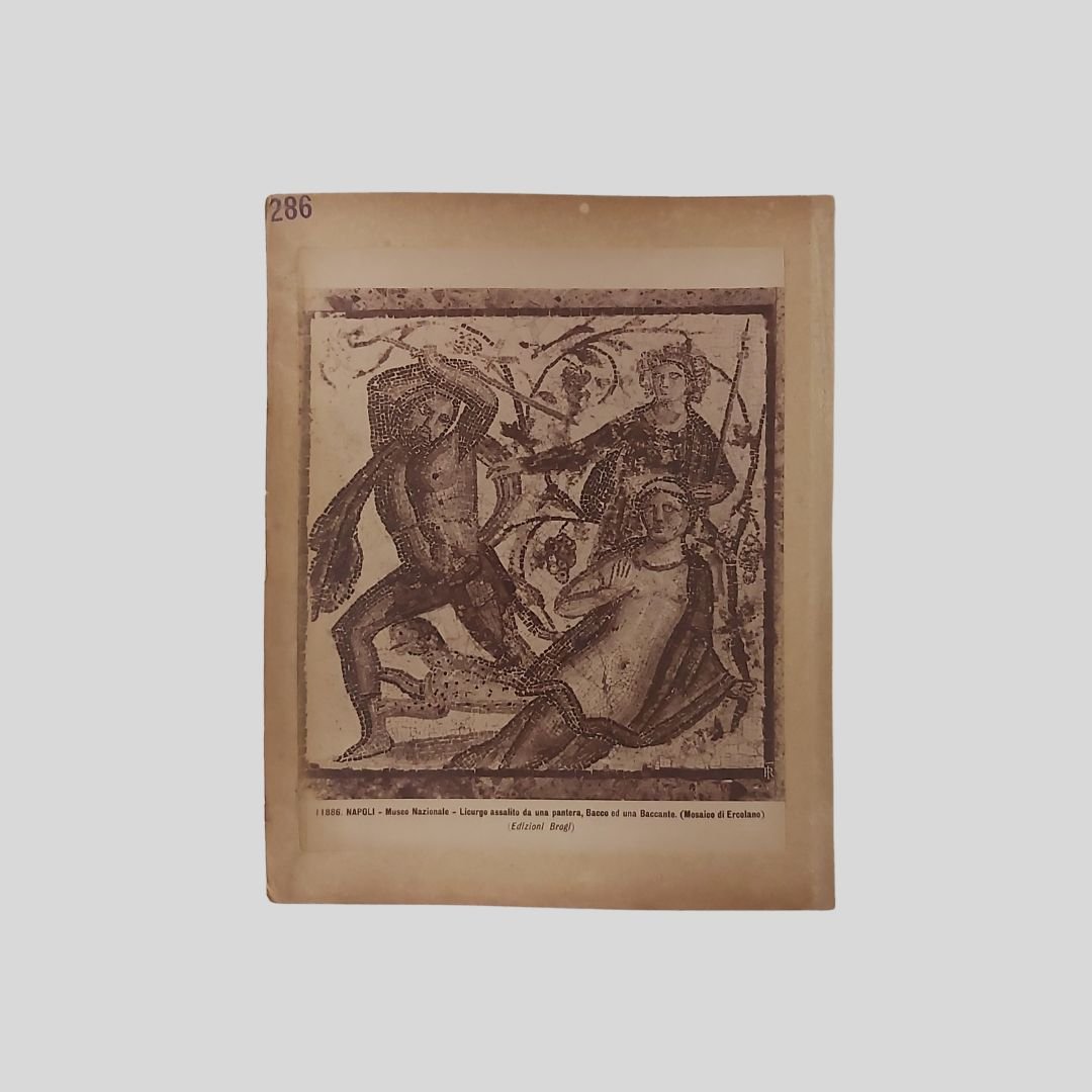 Due fotografie originali all’albumina, applicate al recto/verso di cartoncino dell’epoca, 1880 ca., cm 20,5×25,2 più supporto. Didascalie stampate su lastra con codici editoriali. Supporto lievemente ondulato. In buone condizioni. Giacomo Brogi: due fotografie originali all’albumina raffiguranti mosaici del Museo Archeologico Nazionale di Napoli. Didascalia codice n. 6810: Napoli. Museo Nazionale. Riunione di filosofi Ateniesi: mosaico trovato presso Torre Annunziata. Didascalia codice n. 11866: Napoli. Museo Nazionale. Licurgo assalito da una pantera, Bacco ed una Baccante (Mosaico di Ercolano)