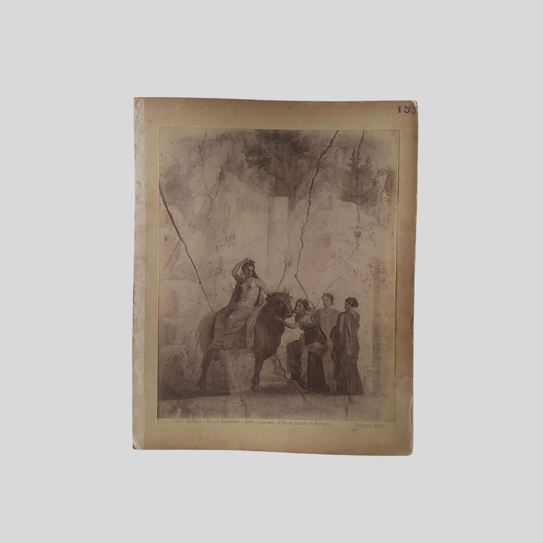 Due fotografie originali all’albumina, applicate al recto/verso di cartoncino dell’epoca, 1880 ca., cm 20×25,2 più supporto. Didascalie stampate su lastra con codici editoriali. Supporto lievemente ondulato. In buone condizioni. Giacomo Brogi: due fotografie originali all’albumina raffiguranti pitture murali di Pompei del Museo Archeologico Nazionale di Napoli. Didascalia codice n. 11289: Napoli. Museo Nazionale. Venere e Urania (Pittura murale di Pompei). Didascalia codice n. 11293: Napoli. Museo Nazionale. Ratto d’Euopa (Pittura murale di Pompei). Giacomo Brogi [Firenze, 1822-1881]. È stato uno dei più importanti fotografi ed editori italiani del XIX secolo. Iniziò la sua carriera come incisore prima di dedicarsi alla fotografia. Nel 1859 aprì a Firenze la ditta “Giacomo Brogi fotografo”. Lo studio ebbe diverse sedi prestigiose a Firenze, tra cui Lung’Arno delle Grazie e Corso Tintori. Sotto la sua guida, l’azienda divenne un punto di riferimento internazionale, con succursali anche a Roma e Napoli (dopo il 1870). Documentò sistematicamente il patrimonio artistico e paesaggistico dell’Italia post-unitaria. Nel 1878 la sua fama è tale da venire nominato “fotografo del re”.