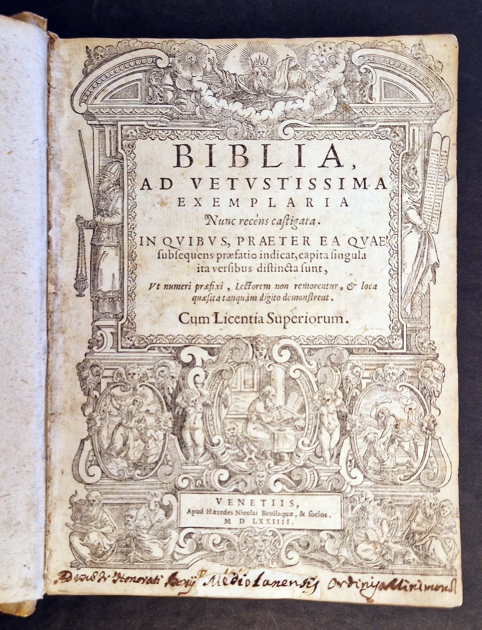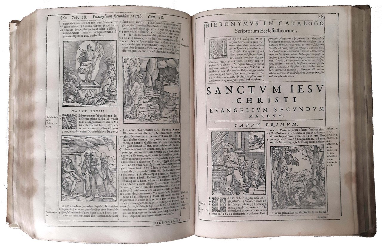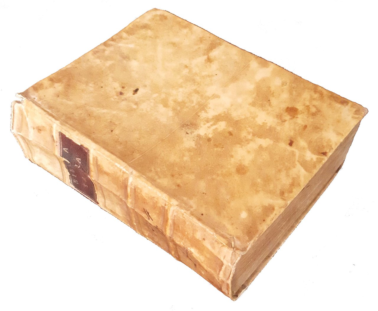 in-4°, 200x146 mm, leg. in piena pergamena rigida, dorso a quattro nervi, titolo a caratteri dorati su tassello in pelle incollato al dorso; pp. [24], 1126, [2]. Frontespizio xil. con titolo all’interno di cornice allegorica riccamente decorata; iniziali xil.; numerosissime larghe illustrazioni xil.; testo su due colonne, all’interno di cornice a filetti. Bell’esemplare riccamente illustrato in edizione Veneziana cinquecentesca di questa Bibbia completa del Vecchio e Nuovo Testamento e delle Lettere. Rif.: IT\ICCU\CNCE\005795. CNCE 5795. OCLC, 797343949. Cond.: Segni d’uso alla legatura (piega verticale lungo il dorso, lievi macchie, capitelli mancanti, parziali mancanze al tassello con il titolo). Frontespizio rifoderato al verso. Carte abbastanza pulite, con rare occasionali macchie; piccolo strappo al margine dell'ultima carta non numerata prima del testo. Esemplare in buone condizioni generali.