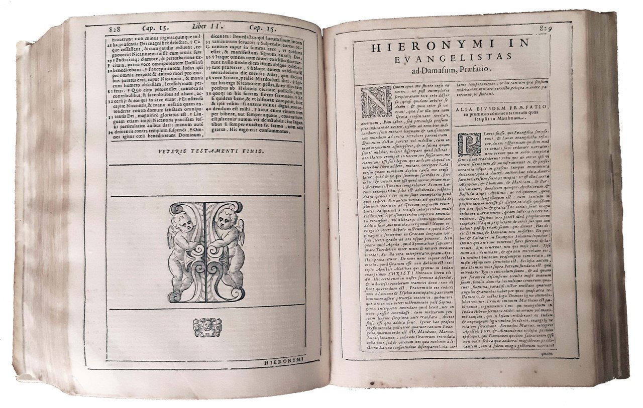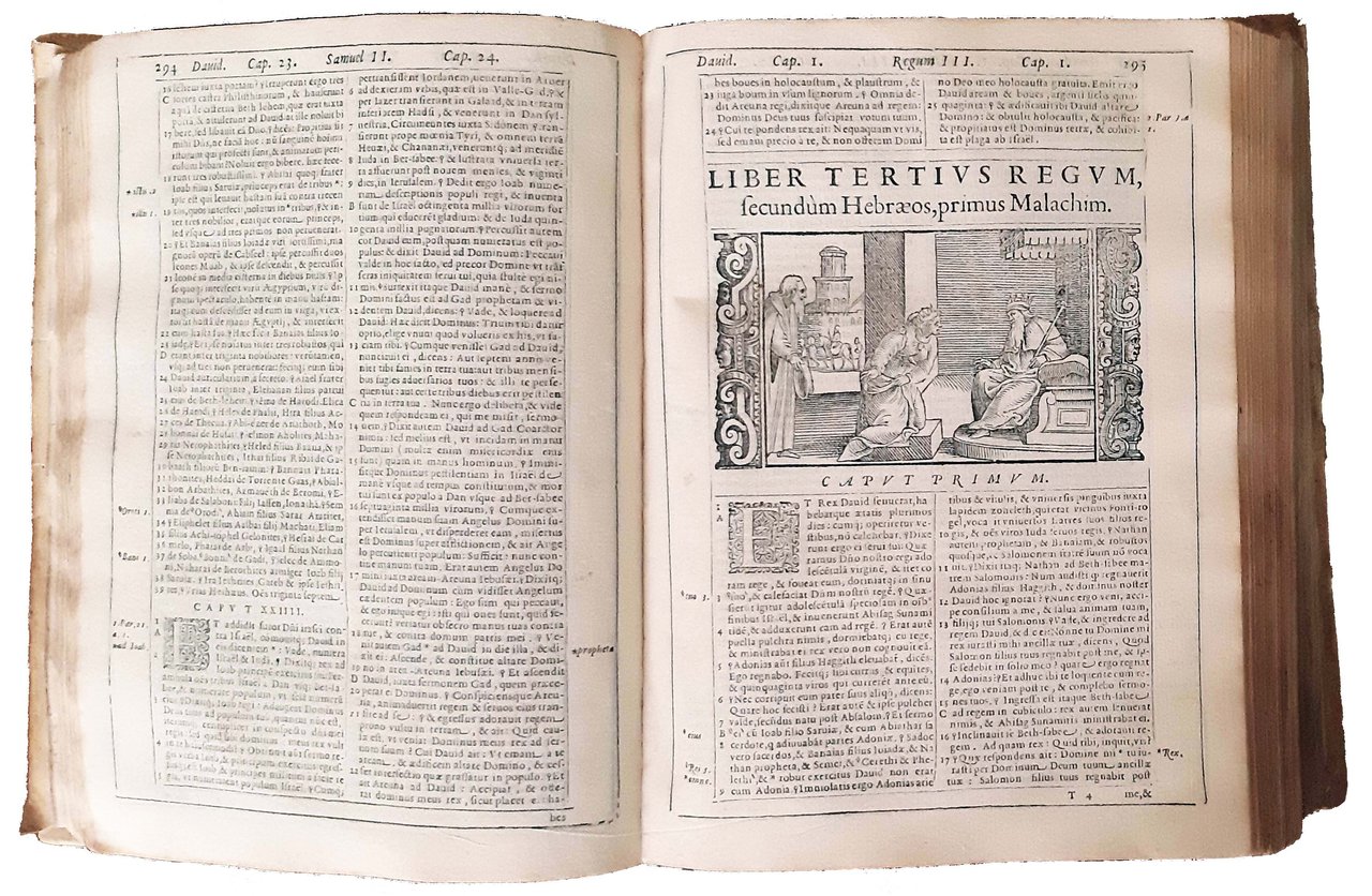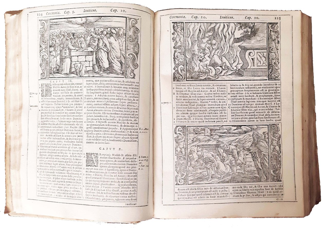 in-4°, 200x146 mm, leg. in piena pergamena rigida, dorso a quattro nervi, titolo a caratteri dorati su tassello in pelle incollato al dorso; pp. [24], 1126, [2]. Frontespizio xil. con titolo all’interno di cornice allegorica riccamente decorata; iniziali xil.; numerosissime larghe illustrazioni xil.; testo su due colonne, all’interno di cornice a filetti. Bell’esemplare riccamente illustrato in edizione Veneziana cinquecentesca di questa Bibbia completa del Vecchio e Nuovo Testamento e delle Lettere. Rif.: IT\ICCU\CNCE\005795. CNCE 5795. OCLC, 797343949. Cond.: Segni d’uso alla legatura (piega verticale lungo il dorso, lievi macchie, capitelli mancanti, parziali mancanze al tassello con il titolo). Frontespizio rifoderato al verso. Carte abbastanza pulite, con rare occasionali macchie; piccolo strappo al margine dell'ultima carta non numerata prima del testo. Esemplare in buone condizioni generali.