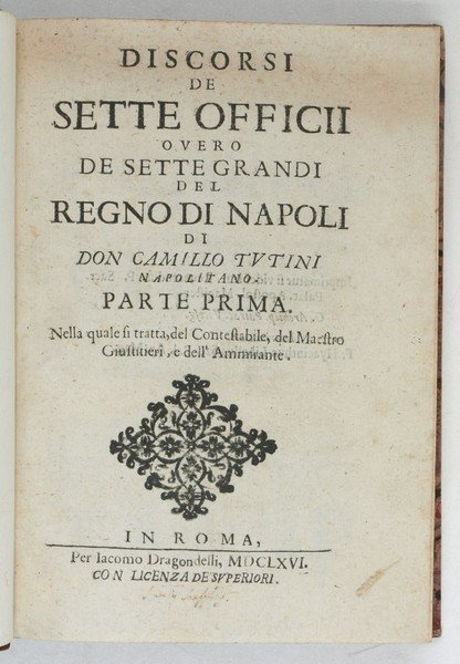 Discorsi de sette officii overo de sette grandi del regno di Napoli [.]. Parte prima [= all published]. Nella quale si tratte, del Contestabile, del Maestro Giustieri, e dell' Ammirante.
