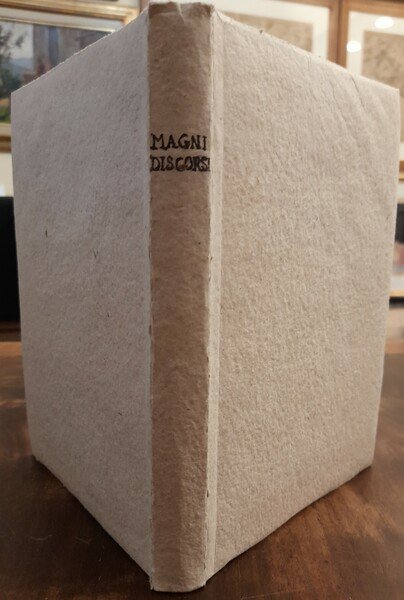 Unito a : "Discorsi di Pietro Paolo Magni Piacentino sopra il modo di fare cauterij ò rottorij à corpi humani", Brescia, B. Fontana, 1618. Manuale sull'arte del salasso, composto da Pietro Paolo Magni, barbiere-chirurgo piacentino. l'Autore unisce agli insegnamenti, questa volta afferibili alla 'scuola di taglio' piacentina, delle bellissime illustrazioni che hanno chiara funzione didattica, mostrando le posizioni che devono assumere barbiere e paziente. Su quelle che erano le prerogative del barbiere flebotomo si esprime nell'introduzione il Magni stesso: «Non tratto dell'arte del sanguinare, se non quanto s'appartiene alla pratica, e alla professione del Barbiere. In 8vo, mm. 140x195h; cc.nn. 4 + pp. 88; cc.nn. 4 + pp. 82. Frontespizio calcografico con titoli entro bella cornice architettonica popolata di putti e figure allegoriche, mancante delle pagine 17/18 (testo e 1 tavola non numerata) nella prima parte; del secondo frontespizio e di pag. 9/10 (solo testo) nella seconda parte, con errori di segnatura e numerazione (a carta E4 e a pag. 75), testo corretto. Esemplare completo dei 2 ritratti dell'Autore, fuori testo e a piena pagina nelle due opere, di 10 tavole (su 11?) a piena pagina nella prima parte, e delle 20 figure nel testo nella seconda. Opera molto rara a trovarsi con la seconda parte sui "CAUTERI". Rilegato in cartoncino grezzo, titolo manoscritto sul dorso, abilmente restaurato e ricostruito un angolo del frontespizio, e anche marginalmente alcune carte. MOLTO RARO SOPRATTUTTO LA SECONDA PARTE. Codice inv.1025803