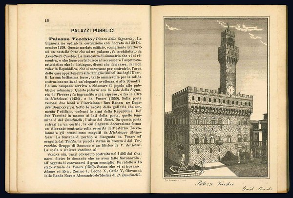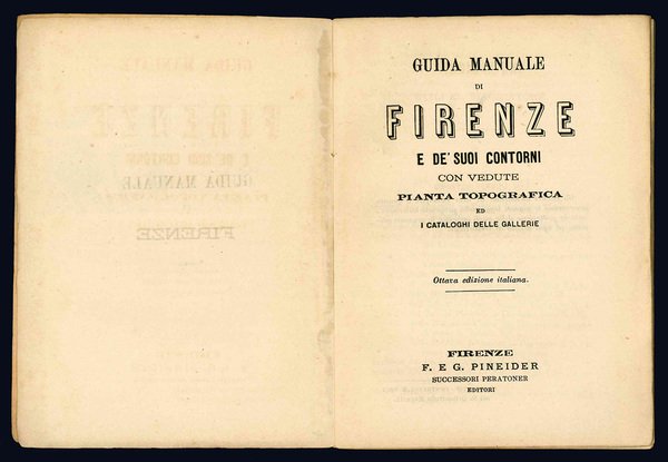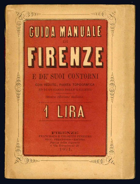 In 16mo (mm 155x115); pp. 140, [12], [7] c. di tav. fuori testo ed [1] pianta della citt? di Firenze ripiegata fuori testo. Le 12 pagine non numerate contengono inserti pubblicitari. Carta leggermente ed uniformemente brunita. Copertina originale. Minime mancanze al margine superiore del dorso. Leggermente sciolto.