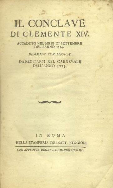IL CONCLAVE DI CLEMENTE XIV ACCADUTO NEL MESE DI SETTEMBRE DELL'ANNO 1774 (1775). Dramma per musica [da Pietro Metastasio] da recitarsi nel Carnevale dell'anno 1775. Libretto d'opera. (1775).