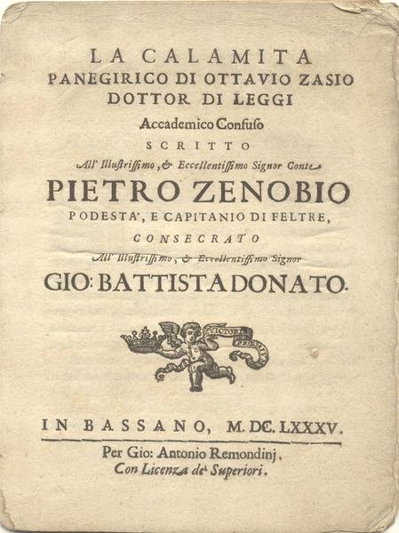 LA CALAMITA. Panegirico di Ottavio Zasio scritto all'illustrissimo, & eccellentissimo signor conte Pietro Zenobio, Podestà e Capitanio di Feltre, consecrato al signor Gio: Battista Donato.