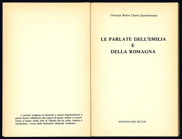 In 8vo (mm 212x140); pp. IX, [1], 275, [3]. Copertina editoriale illustrata. Importante antologia di poesia dialettale emiliano-romagnola, con glossario, cenni grammaticali e ampia bibliografia.