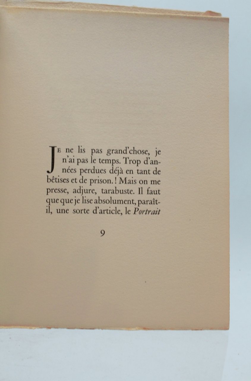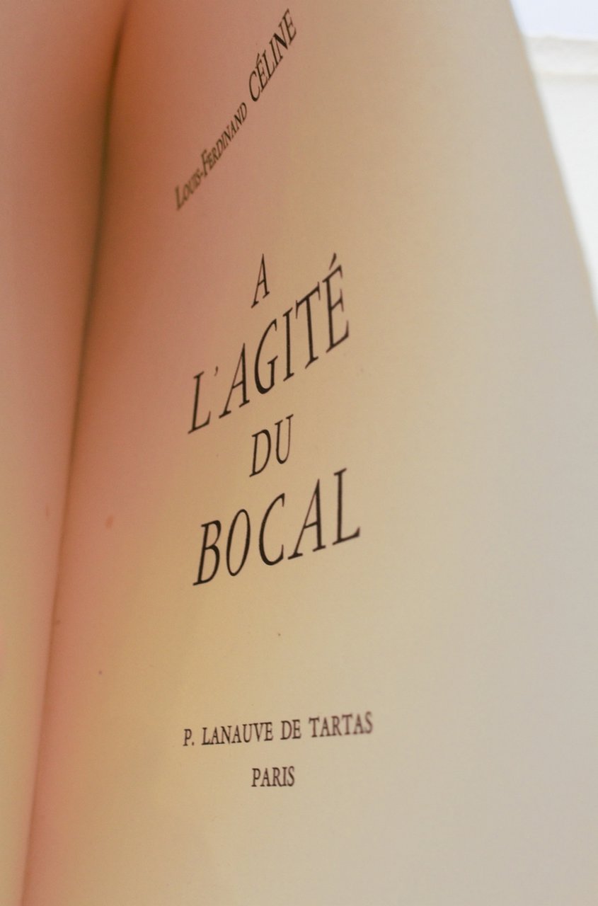 Pierre Lanauve de Tartas | Paris 1948 | 14 x 20 cm | en feuilles | [ENGLISH DESCRIPTION ON DEMAND] | Édition originale, un des 150 exemplaires sur B.F.K. de Rives, seul tirage après 50 autres grands papiers. Quelques discrètes restaurations au dos et plats de couverture. Au colophon, notre exemplaire est exceptionnellement enrichi de la très rare signature manuscrite de Louis-Ferdinand Céline, alors en exil au Danemark. L'éditeur, Pierre Lanauve de Tartas, a précisé, juste au dessus de la signature de Céline, « Exemplaire d'auteur ». Ce très rare exemplaire porte effectivement, imprimé sur le premier plat, le titre initial de l'ouvrage : Lettre à J. B. Sartre. Nous joignons le papillon volant portant le titre définitif « à l'agité du bocal » et qui a été encollé sur l'intégralité du tirage diffusé par la suite. Précieux exemplaire d'auteur de la cinglante réponse de Céline à Jean-Paul Sartre, qui, dans Réflexions sur la question juive, l'avait accusé d'avoir été payé par les Allemands sous l'Occupation pour avoir tenu de telles et indéfendables positions antisémites.