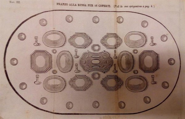 in-8, pp. IV, 551, leg. m. tela coeva. Con 4 tavv. ripp. al fine raffiguranti i diversi modi di apparecchiare la tavola: all’italiana, alla francese, alla russa, e all’inglese. Con più di 1500 ricette suddivise per categoria. Terza ediz. e la prima illustrata. Westbury p. 136. [082]