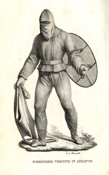 Nuovo metodo di difesa con vestiti di amianto ad uso dei Pompieri nei casi d'incendj.