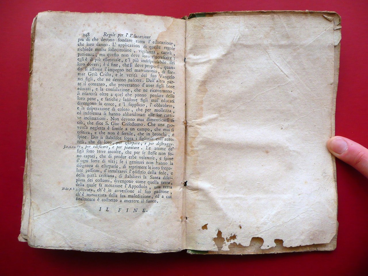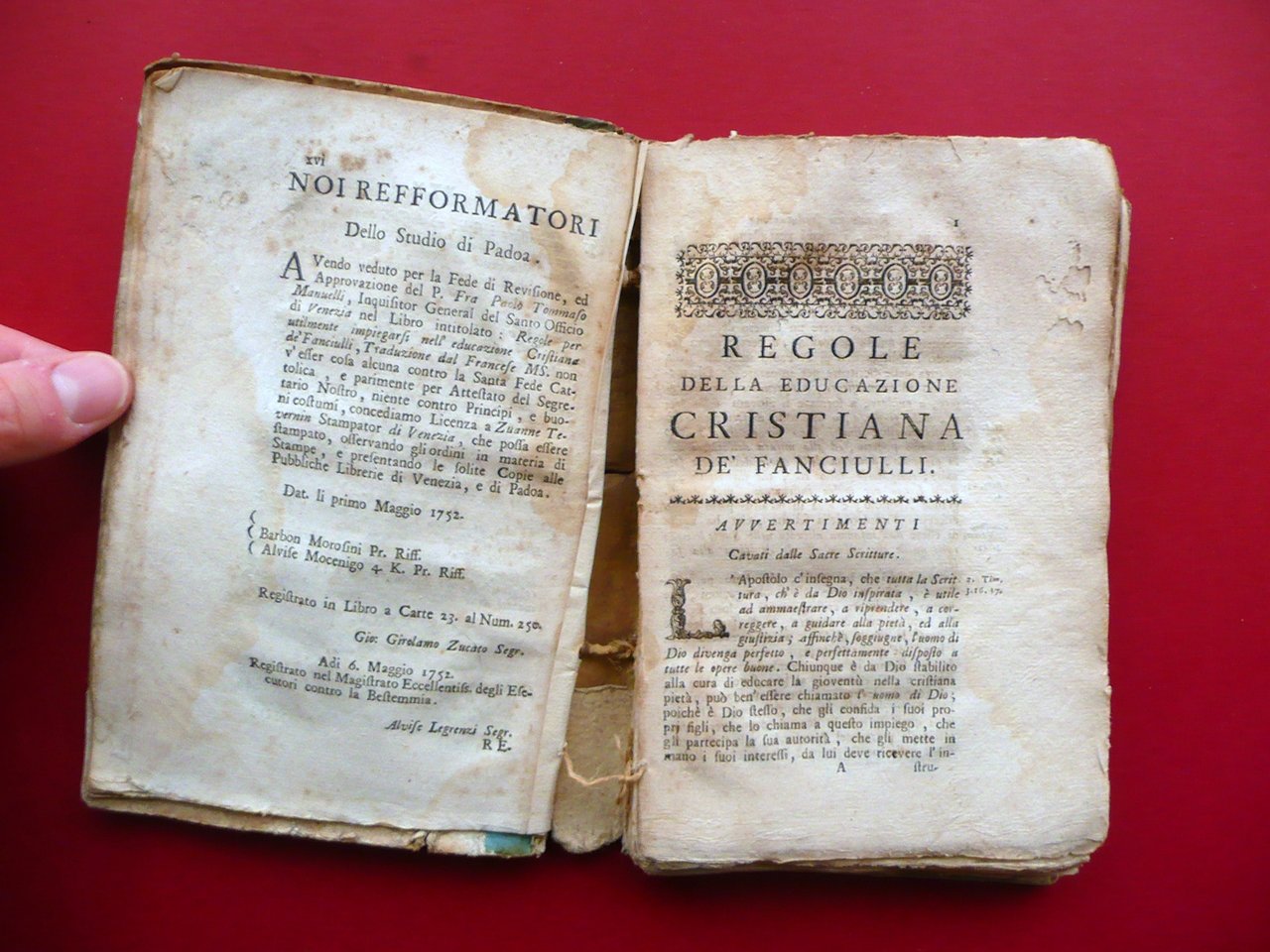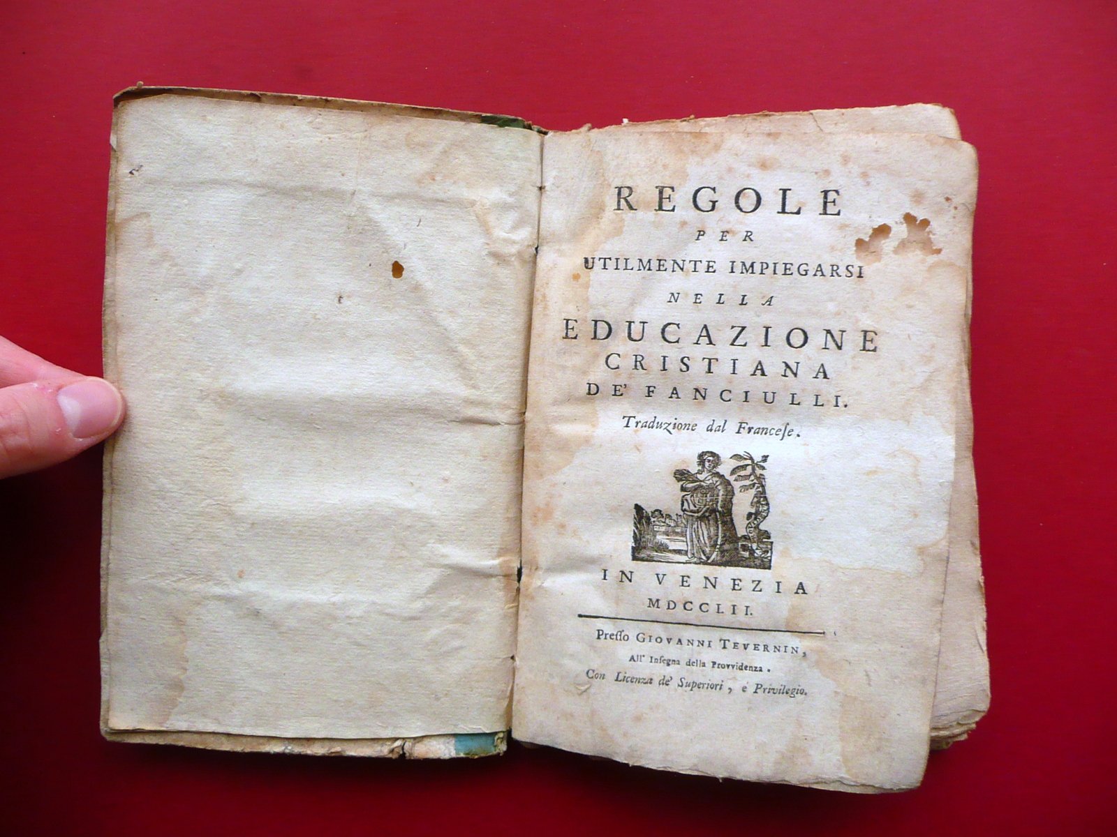 Settecentina, Regole per utilmente impiegarsi nella educazione cristiana de' fanciulli traduzione dal francese Presso Giovanni Tevernin, in Venezia 1752; cm 19x12; pp. XVI-248; legatura d'epoca in tutto cartonato muto. Condizioni di conservazione Esemplare in condizioni più che discrete con tracce d'uso; alcuni piccoli leggeri aloni e bruniture; leggere ombre di gore di vecchia umidità che non compromettono il testo; dorso e margini dei piatti con alcune piccole abrasioni. Frontespizio, ultima carta bianca e poche pagine con minime mancanze. Cuciture di alcuni fascicoli allentate. SETT11.L19156 N P