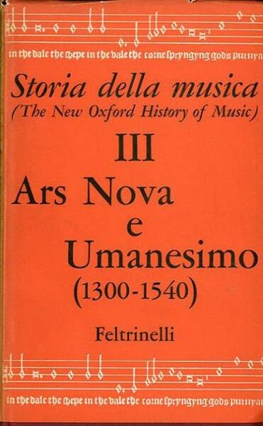 IX, 628 p., [16] c. di tav. : ill. : ill. ; 25 x 15 cm. Questo terzo volume della oxfordiana "Storia della musica" illustra le vicende di un periodo di capitale importanza per l'arte musicale e la cultura europee; il periodo dell'umanesimo e del primo rinascimento, in cui la musica si liberò da una secolare servitù e raggiunse la dignità di arte autonoma. Titolo originale dell'opera: «New Oxford history of music. 3. Ars nova and the Renaissance (1300-1450)». Traduzione di Laura Lovisetti Foà. Legatura editoriale, coperta in cartone rigido telato di colore rosso scuro, con impresso il titolo in oro al dorso, muto il piatto. Sovraccoperta in carta colorata. Qualche segno del tempo alla sovraccoperta (ingiallimento del dorso) e piccole lacerazione ai profili, per il resto esemplare integro. All'interno tavole fuori testo illustrate su carta patinata lucida in b/n (8) e a colori (8). Codice libreria 6671.