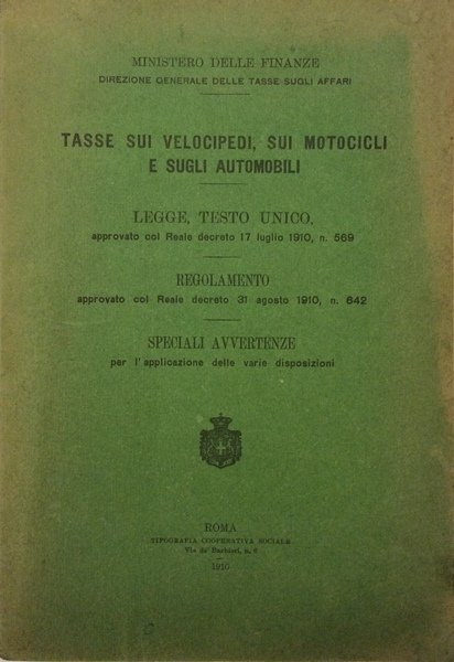 TASSE SUI VELOCIPEDI, SUI MOTOCICLI E SUGLI AUTOMOBILI. | Libri antichi e moderni | MINISTERO DELLE FINANZE