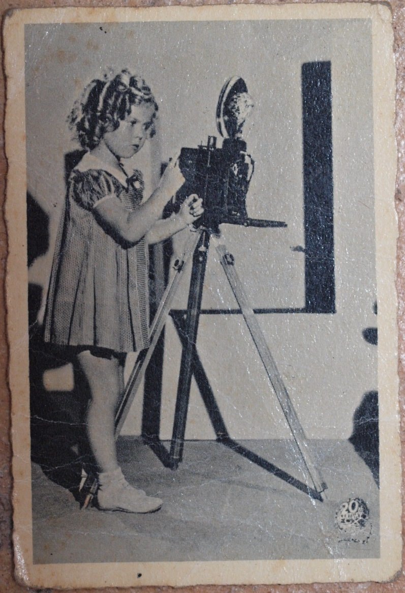 Bella cartolina che mostra Shirley Temple (1928-2014) che scatta una fotografia. Al verso "14. Shirley fotografa" Senza data ma degli anni '50. In discrete condizioni ma con usure. Dim. cm 9x6. Beautiful card showing Shirley Temple (1928-2014) shooting a photo. Not dated but of 1950's. In verso "14. Shirley fotografa". In fair conditions with wearings.
