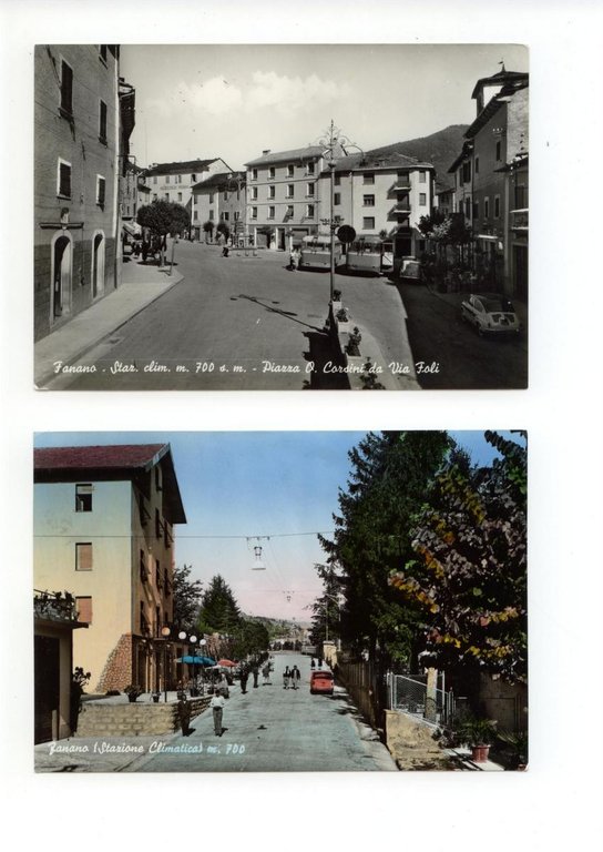 2 cartoline Fanano Piazza Corsini da Via Foli Stazione Climatica viaggiata 1959