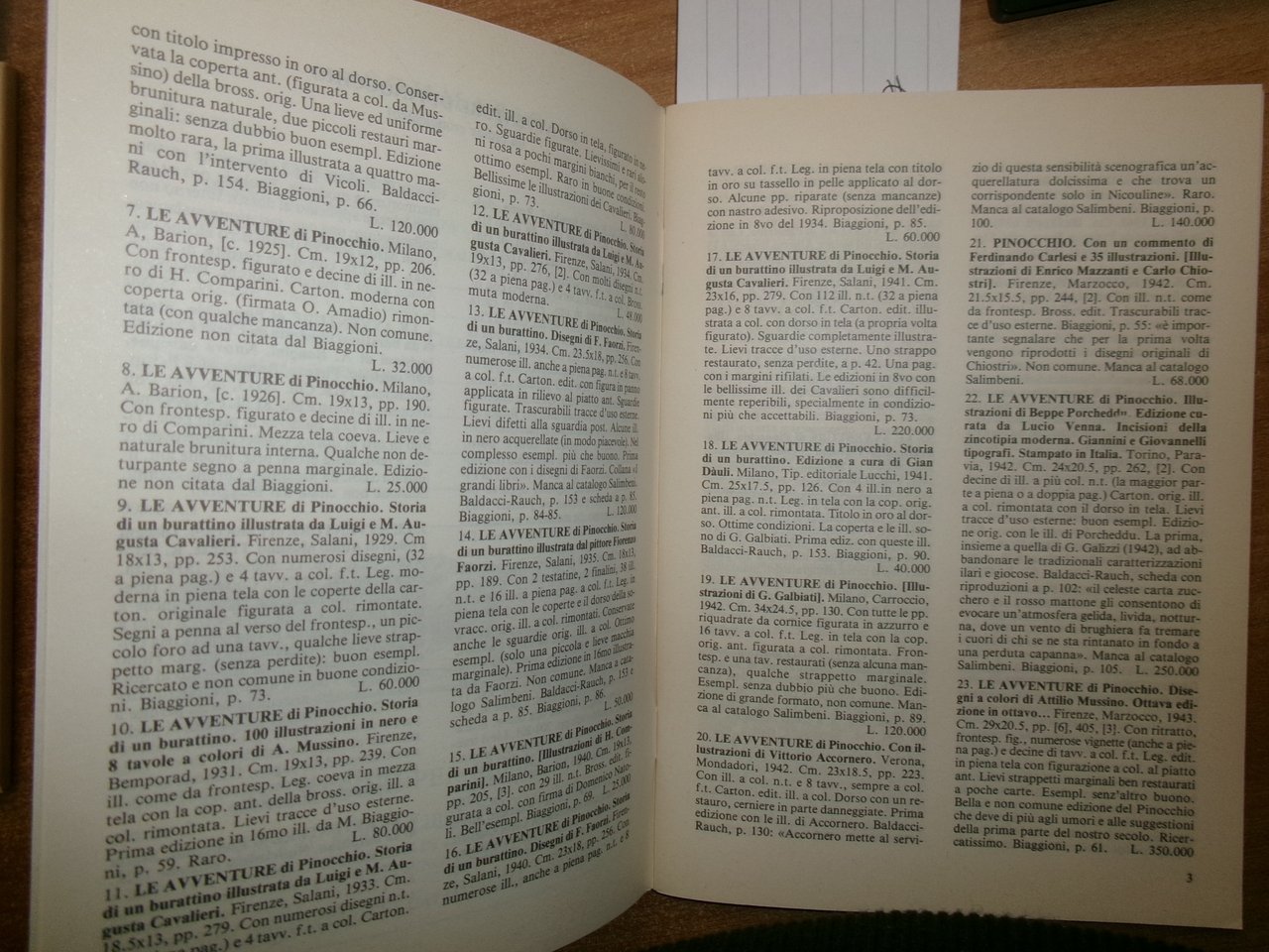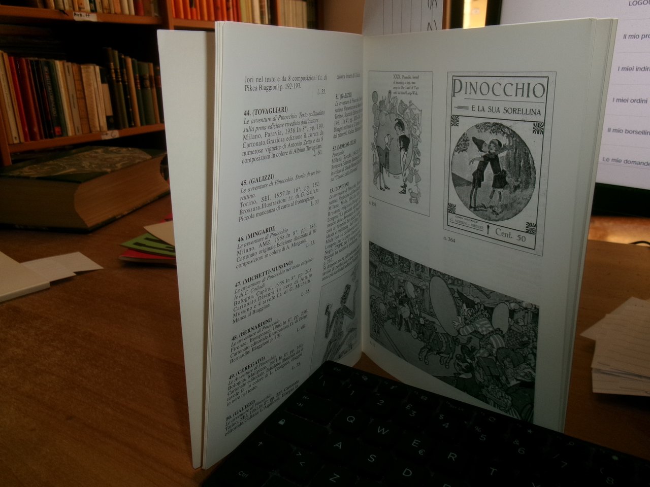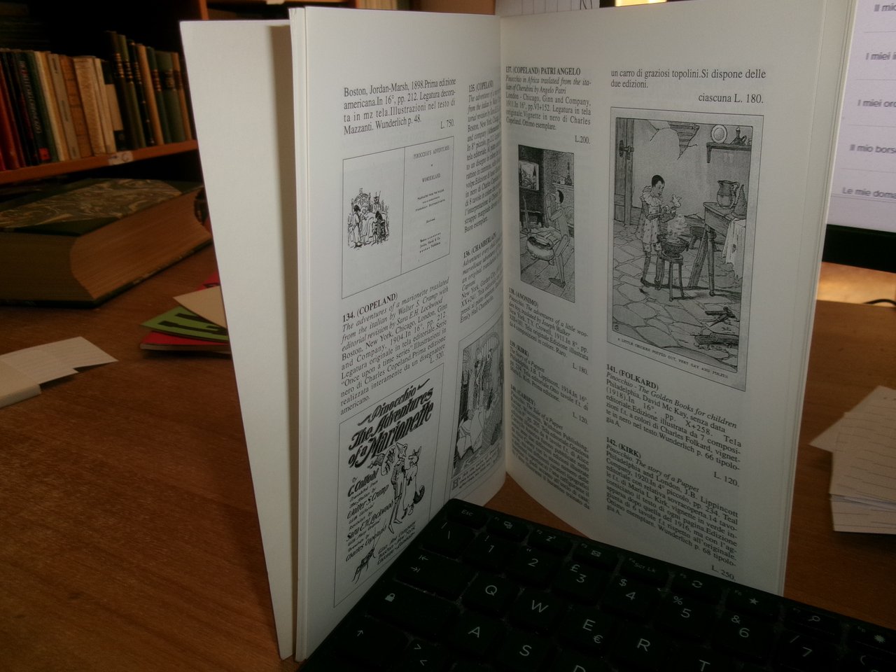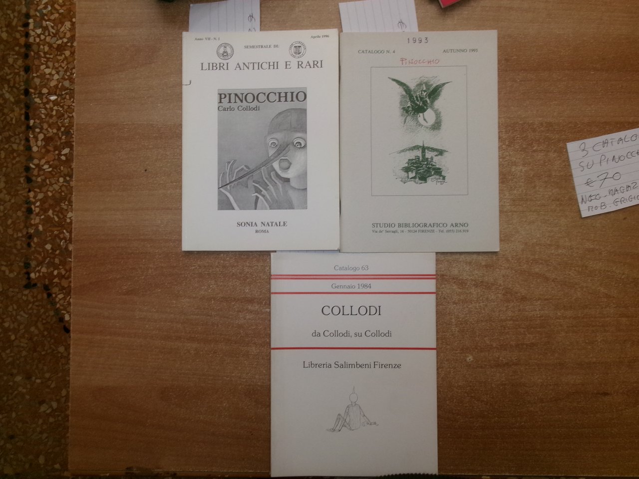3 Cataloghi. COLLODI da COLLODI, su COLLODI. PINOCCHIO. In-8°, br. edit. Firenze, Libreria Salimbeni, Libreria Catalogo 63. 78 pp. con numerose illustrazioni n.t. con prezzi in lire.; PINOCCHIO di Sonia Natale, Roma, 1996. Descrizione di 443 libri con numerose illustrazioni n.t. e prezzi in lire.; Catalogo n. 4. PINOCCHIO. Firenze, Studio Bibliografico Arno, Autunno 1993. 65 pp. con prezzi in lire. Neg. magazz. mob. grigio entro busta trasp.