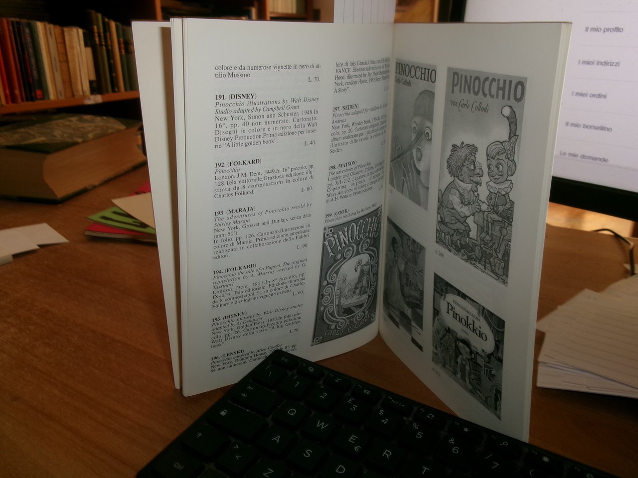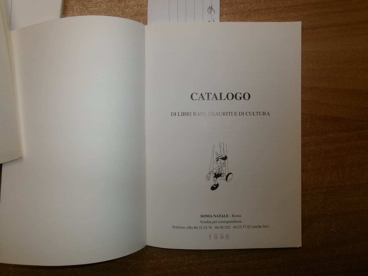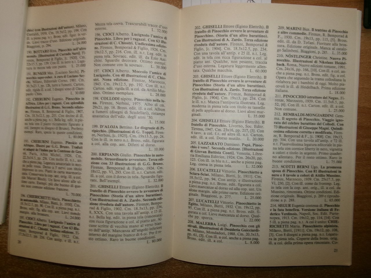 3 Cataloghi. COLLODI da COLLODI, su COLLODI. PINOCCHIO. In-8°, br. edit. Firenze, Libreria Salimbeni, Libreria Catalogo 63. 78 pp. con numerose illustrazioni n.t. con prezzi in lire.; PINOCCHIO di Sonia Natale, Roma, 1996. Descrizione di 443 libri con numerose illustrazioni n.t. e prezzi in lire.; Catalogo n. 4. PINOCCHIO. Firenze, Studio Bibliografico Arno, Autunno 1993. 65 pp. con prezzi in lire. Neg. magazz. mob. grigio entro busta trasp.