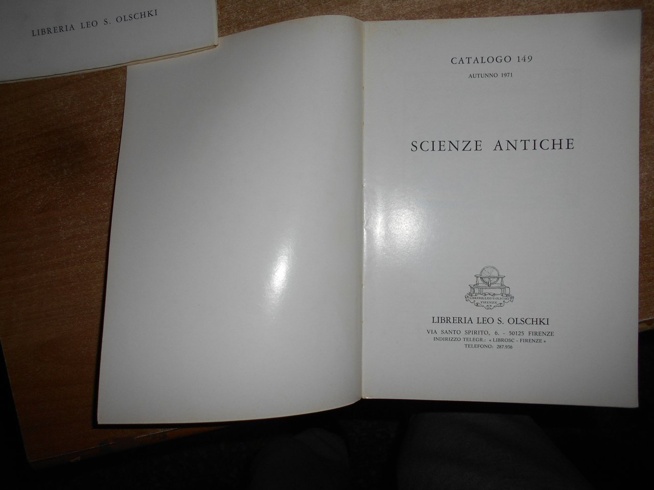 3 cataloghi SCIENZE ANTICHE. Firenze, Libreria LEO S. OLSCHKI n° 145/154/149. Accurata descrizione di numerosi libri rari e antichi con prezzi ed alcune riproduzioni n.t. Ottimo stato. Neg. magazz, mob. grigio entro busta trasp.